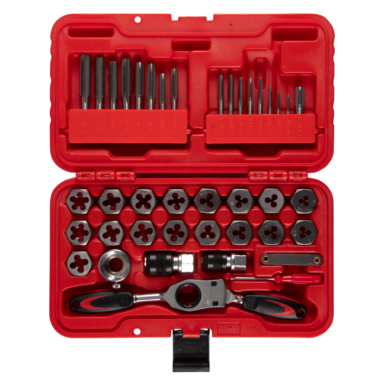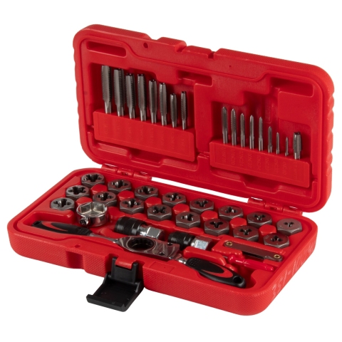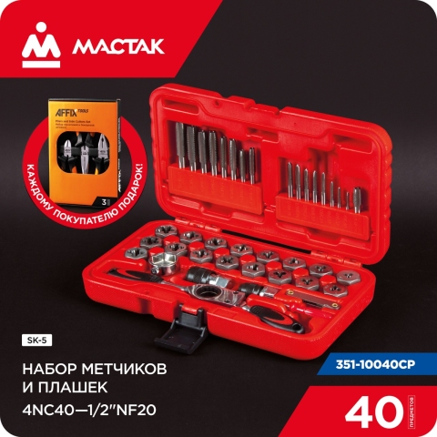 Материалы – инструментальная быстрорежущая сталь SK5, сталь Cr-V, PP+TPR (рукояти реверсивного ключа), пластик PE-HD (кейс);