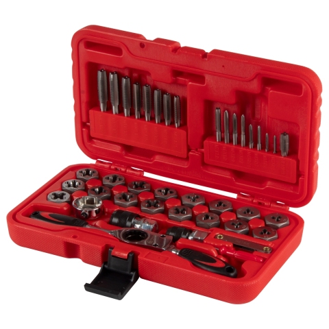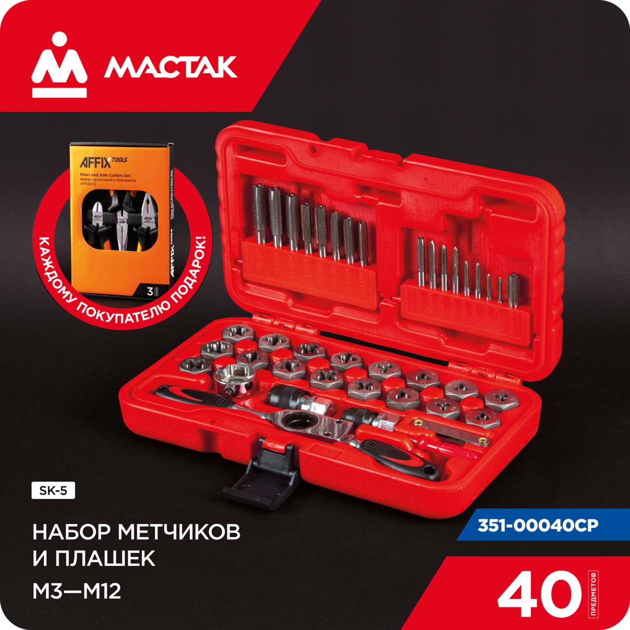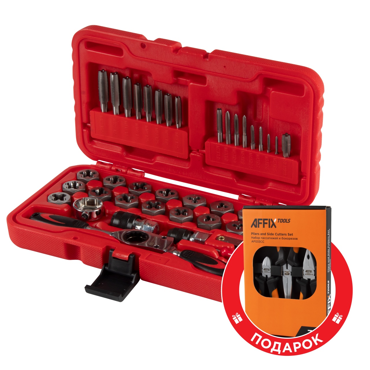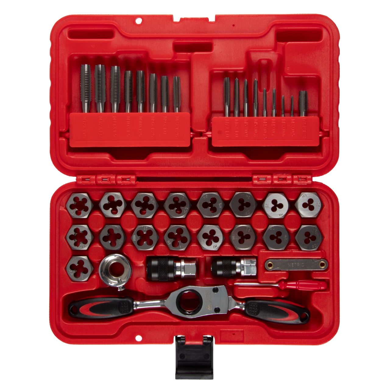 Материалы – инструментальная быстрорежущая сталь SK5, сталь Cr-V, PP+TPR (рукояти реверсивного ключа), пластик PE-HD (кейс);