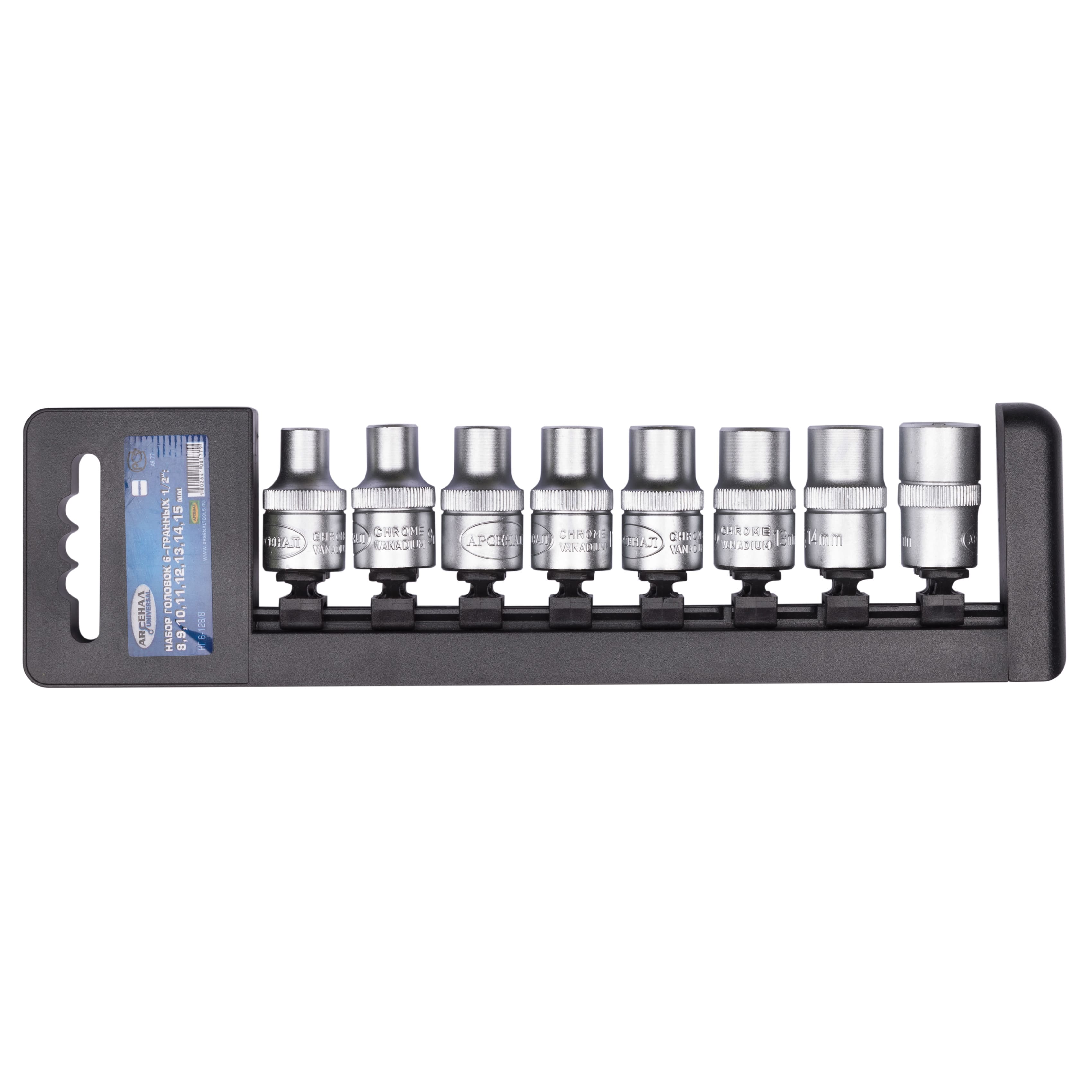 Набор головок НГ Арсенал 6-128/8, 23912 - это универсальный набор шестигранных торцовочных головок различного типоразмера, который ориентирован на отворачивание прикипевшего крепежа в относительно доступном месте с применением максимального усилия на рычаг. Все головки набора выполнены из хромванадиевой стали с нанесением матового напыления. В составе набора 8 шестигранных головок различного размера (8, 9, 10, 11, 12, 13, 14, 15 мм), с присоединительным квадратом - 1/2. Набор универсален и является незаменимым для проведения технического осмотра автомобиля.