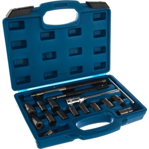 Набор фрез для ремонта седел форсунок дизельного двигателя из 17 предметов Spin 05.090.70 предназначен для зачистки посадочного места и настройки правильной посадки новых дизельных форсунок. Инструмент широко используют в автосервисах и ремонтных мастерских во время технического обслуживания транспортных средств. Комплект поставляется в пластиковом кейсе из прочной пластмассы с ручкой и защелками для компактного хранения и удобной переноски.