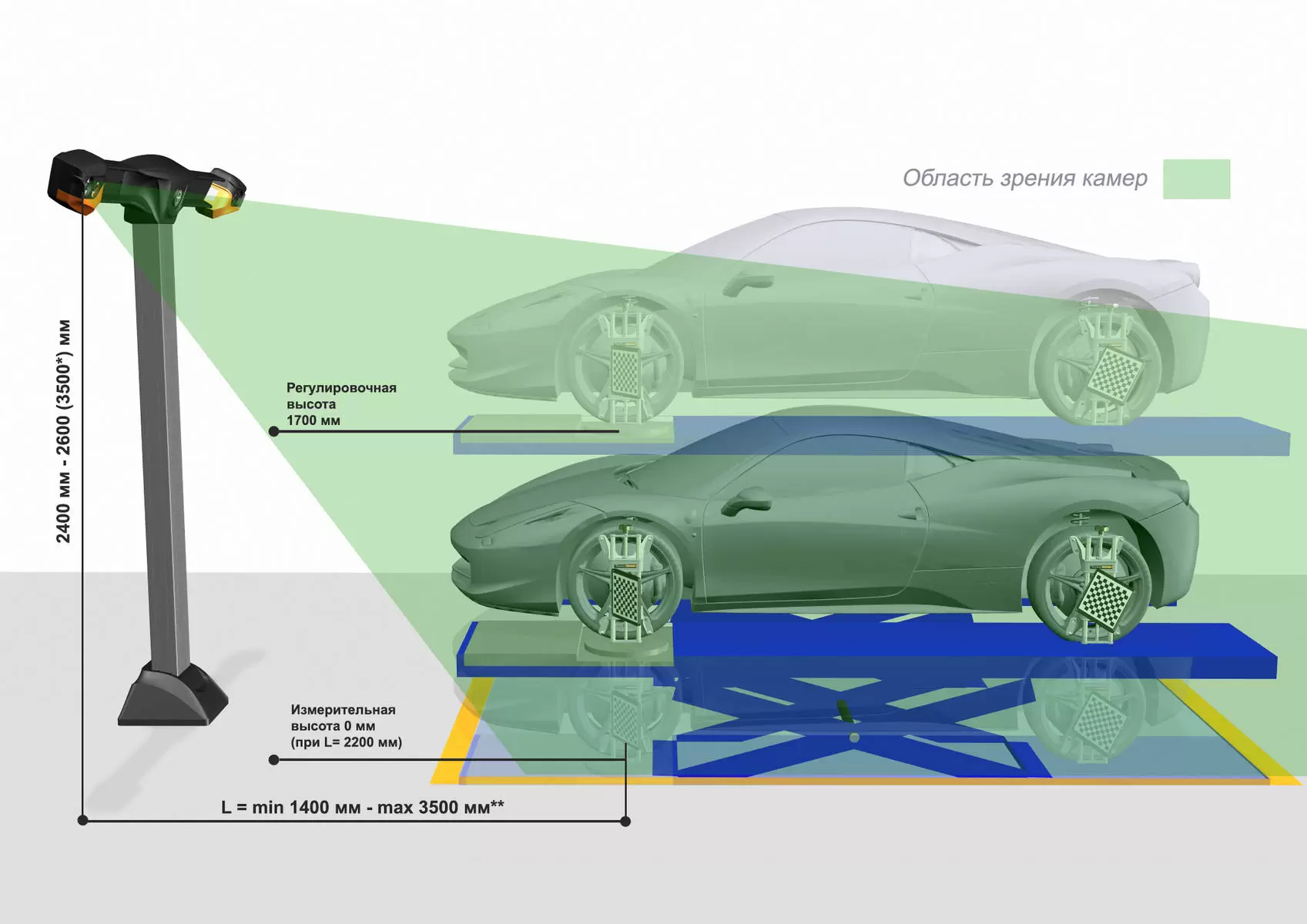 | Расстояние от камер до центра передних поворотных платформ | 2200 - 3000 мм (измерительная высота на уровне пола) |